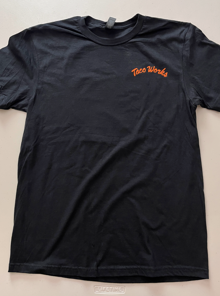 Taco Works t shirt. Small logo on front of shirt, and large image on the back. Sizes S-2XL, screen printed on premium soft cotton shirts. Shipping included. Fit is slightly tailored, if between sizes order a size up.